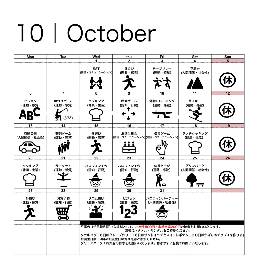 クッキング:8日はクレープ作り、18日はサンドイッチとスイートポテト、20日はかぼちゃチップスを作ります。